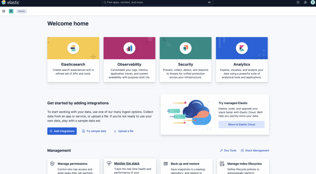 . If your previous session has expired, you’ll be prompted to log in again. After successfully signing in, the Kibana homepage should appear.