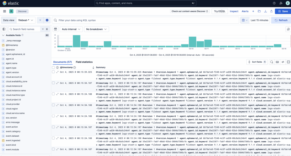 index pattern from the list to view data collected by Filebeat. By default, the page displays logs from the past 15 minutes. You’ll notice a histogram at the top representing log activity, with detailed log entries listed underneath.