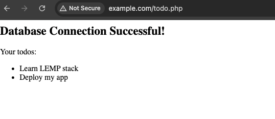 Visit http://example.com/todo.php. See your todos? Success! Clean up by dropping the DB if testing only: DROP DATABASE example_db; DROP USER ‘testuser’@’localhost’;.